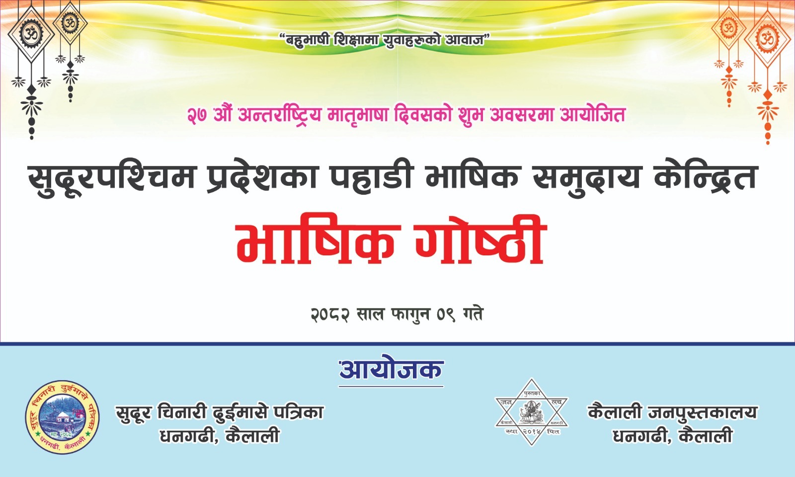 On the auspicious occasion of the 27th International Mother Language Day, a special Linguistic Seminar is being organized with a focus on the hill linguistic communities of Sudurpashchim Province. Under the theme "Youth Voice in Multilingual Education," the organizers cordially invite all concerned individuals to grace the event with their presence.